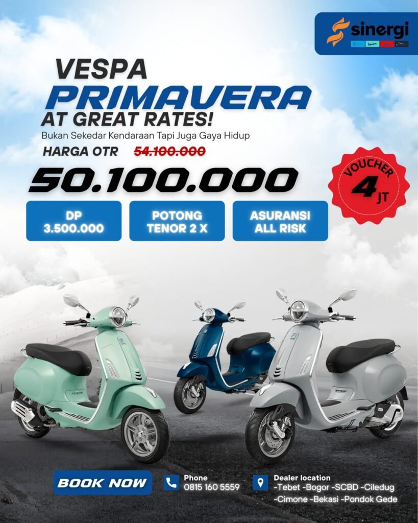 Promo Khusus Vespa Matic Type Primavera 150 New Vin Code 2025. penawaran terbaik di bulan MEI untuk kamu yang ingin memiliki vespa matic impian kamu, dapatkan promo khususnya dengan klik tombol di bawah ini